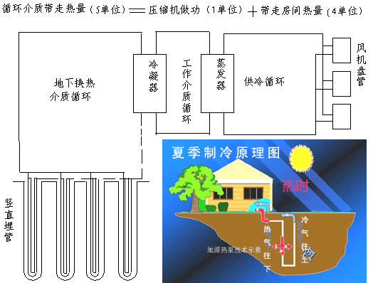 地源熱泵制冷原理:地源熱泵系統(tǒng)在制冷狀態(tài)下,地源熱泵機組內(nèi)的壓縮機對冷媒做功,使其進行汽-液轉(zhuǎn)化的循環(huán)。通過冷媒/空氣熱交換器內(nèi)冷媒的蒸發(fā)將室內(nèi)空氣循環(huán)所攜帶的熱量吸收至冷媒中,在冷媒循環(huán)的同時再通過冷媒/水熱交換器內(nèi)冷媒的冷凝,由循環(huán)水路將冷媒中所攜帶的熱量吸收,最終通過室外地能換熱系統(tǒng)轉(zhuǎn)移至地下水或土壤里。在室內(nèi)熱量通過室內(nèi)采暖空調(diào)末端系統(tǒng)、水源熱泵機組系統(tǒng)和室外地能換熱系統(tǒng)不斷轉(zhuǎn)移至地下的過程中,通過冷媒-空氣熱交換器(風機盤管),以13℃以下的冷風的形式為房供冷。